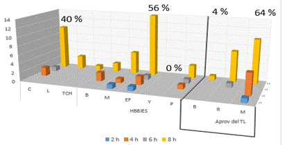 El grafico No.1 representa como se comportó el tiempo libre según las variables que lo analizan, se refleja que el 72 % (n=25) de la población estudiada goza de 8 horas de tiempo libre al día. Se encuestaron sobre los posibles hobbies que realizaban dígase: caminatas, paseos con amigos, Thai Chi, Yoga, ejercicio físico, meditación, lectura y bailoterapia; constatando que predominó la práctica de ejercicio físico y caminatas con un 56 % y 40 % respectivamente sin embargo ningún individuo practica yoga. Además el colectivo de autores en base a las actividades que realizaban los pacientes en su tiempo libre valoraron el aprovechamiento del tiempo libre por estas personas, evidenciando que el mayor por ciento de la población (64 %) presenta un mal aprovechamiento de su tiempo libre y solo el 4 % de esta tenía un buen aprovechamiento de su tiempo libre.