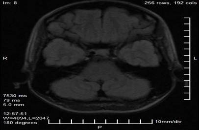 Los estudios complementarios incluyeron una resonancia magnética de cráneo con protocolo neurooftalmológico, la cual reveló una imagen nodular, lobulada y bien delimitada en proyección de la glándula pineal, con dimensiones de 29 mm × 28 mm × 27 mm. La lesión presentaba características de señal heterogénea, con áreas de hiperintensidad en secuencias T1 y T2 sugestivas de componente hemorrágico o vascular, y evidenciaba efecto compresivo sobre el tectummesencefálico y los colículos superiores. No se observaron signos de hidrocefalia obstructiva ni hipertensión intracraneal en los cortes obtenidos (Figuras 2 y 3).